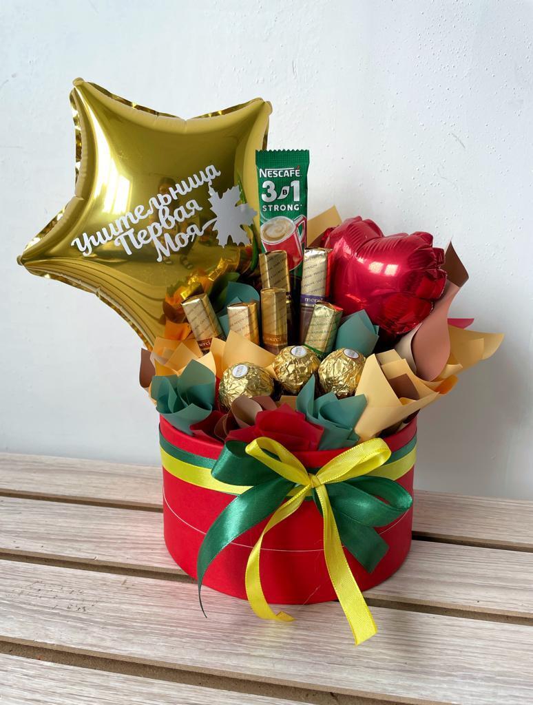 Подарочный бокс на 1 сентября — это тёплое и оригинальное поздравление для любимой учительницы. Внутри — шоколадные конфеты Ferrero, батончики, кофе 3в1 и воздушные шары в форме звезды и сердца. Особенно выделяется золотой шар с надписью «Учительница первая моя», который создаёт атмосферу благодарности и радости. Красочная упаковка, ленты и осенние акценты делают этот подарок особенно душевным. Идеально подойдёт для первого учителя, классного руководителя или воспитателя. В наличии и с быстрой доставкой по Хабаровску.