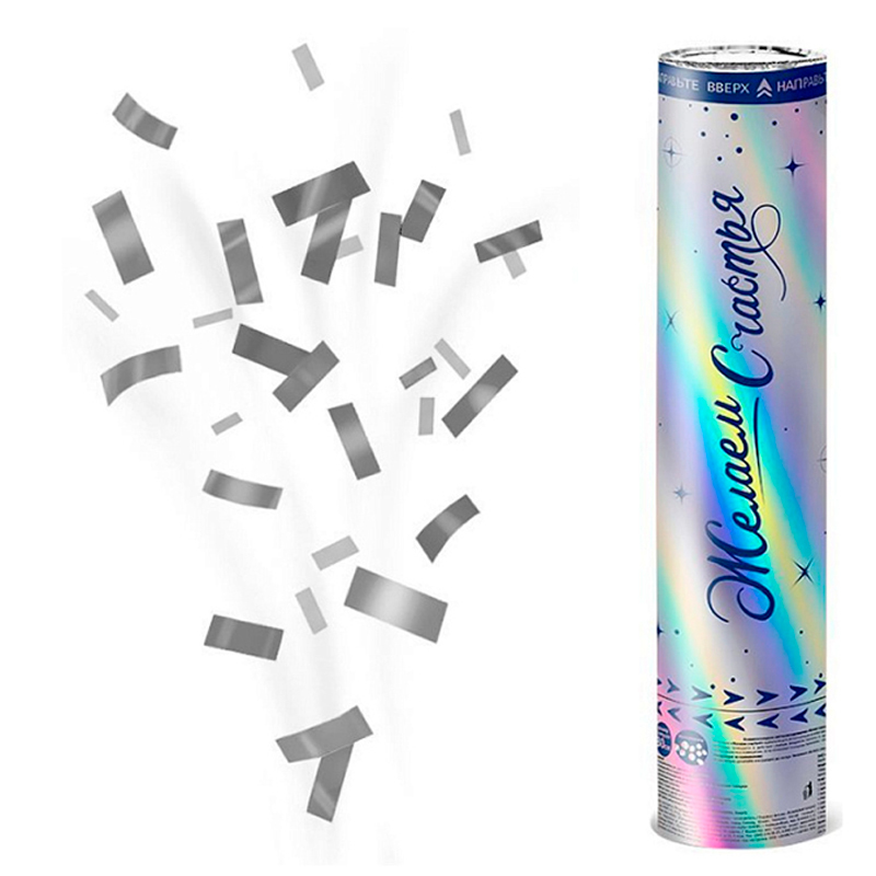 - Пневмохлопушка металлизированная «Желаем счастья!» Серебряное конфетти 30 см