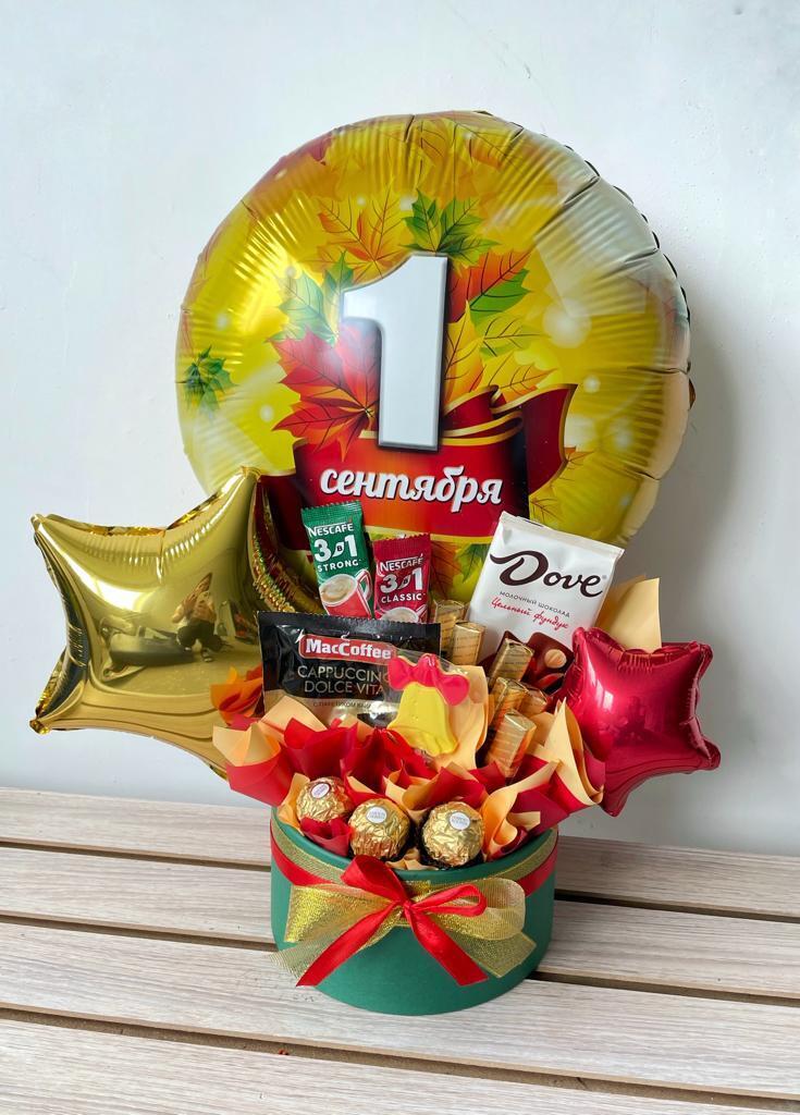 Подарочный бокс на 1 сентября — универсальный подарок для учителя, классного руководителя или воспитателя. Внутри — ароматный кофе MacCoffee и Nescafe 3в1, шоколад Dove и Ferrero Rocher, а также фольгированные воздушные шары с надписями и осенним дизайном. Особый акцент — большой шар с надписью «1 сентября», создающий праздничное настроение. Бокс оформлен в ярких осенних цветах с лентами и декоративной бумагой. Отличный выбор, чтобы выразить благодарность и порадовать учителя в День знаний. Доставка по Хабаровску.